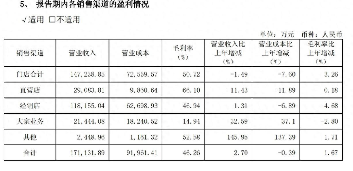 报告期内,我乐家居实现营业收入约17.11亿元,同比增长2.70%。营业收入变动原因主要是报告期内经销业务和大宗业务收入较同期增加所致。在各销售渠道中,经销店实现收入约11.82亿元,较上年同期增加1.31%,占全渠道业务收入比重69.04%,毛利率为46.94%;直营店实现收入约2.91亿元,较上年同期减少11.43%,占全渠道业务收入比重16.99%;大宗业务实现收入约2.14亿元,较上期增加32.59%,占全渠道业务收入比重12.53%。