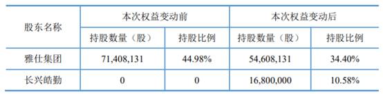本次权益变动前,公司控股股东雅仕集团持有公司股份71,408,131股,占公司总股本的44.98%;长兴皓勤未持有公司任何股份。本次权益变动后,公司控股股东持有公司股份54,608,131股,占公司总股本34.40%;长兴皓勤持有公司股份16,800,000股,占公司总股本10.58%。