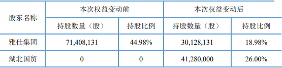 本次交易完成后,上海雅仕控股股东将由雅仕集团变更为湖北国贸,实际控制人由孙望平变更为湖北省人民政府国有资产监督管理委员会。本次转让价格为17.64元/股,本次股份转让总价款为人民币728,179,200元。