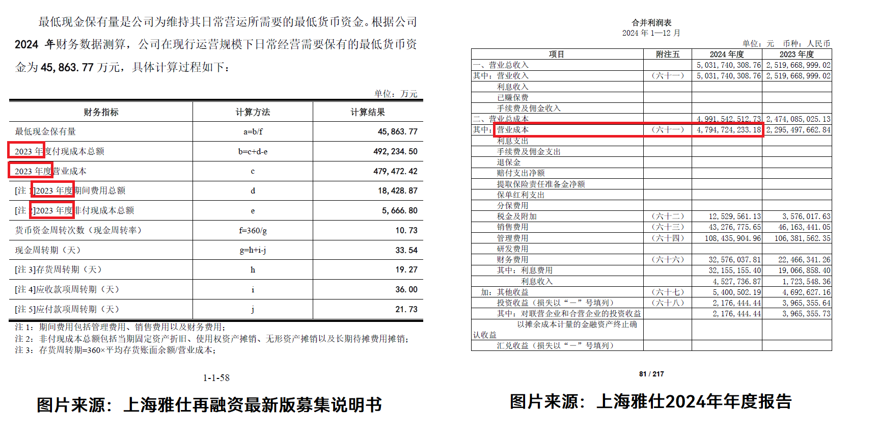 资金缺口从2亿元到12亿元的跳跃式增长,除了测算方式的改变,上海雅仕2024年末财务数据的变化是主要因素。第三版和第四版募集说明书测算数据最大的差异就在于最低现金保有量,从1.65亿元攀升至4.59亿元,上涨的原因主要是上海雅仕年度营业成本从2023年的22.95亿元涨至2024年的47.95亿元,同时现金周转率从2023年的14.67降至2024年的10.73。