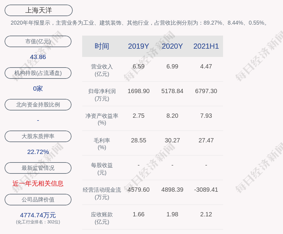 2020年年报显示,上海天洋的主营业务为工业、建筑装饰、其他行业,占营收比例分别为:89.27%、8.44%、0.55%。