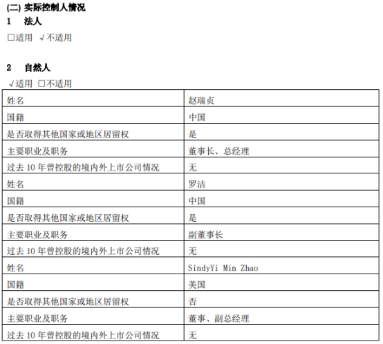 迪生力2023年年报显示,赵瑞贞、罗洁均为中国国籍,已取得其他国家或地区居留权,Sindy Yi Min Zhao为美国国籍,无其他国家或地区居留权。