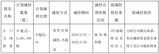 力鸿公司拟在公告披露之日起15个交易日后的3个月内,通过集中竞价方式减持公司IPO前取得的股份及其对应上市后以资本公积转增股本方式取得的股份数量合计不超过4,281,446股,即合计减持IPO前取得的股份及其对应上市后以资本公积转增股本方式取得的股份比例不超过公司总股本的1%。在减持计划实施期间,公司发生送股、转增股本、增发新股或配股等事项的,减持股份数量及股份比例进行相应调整。