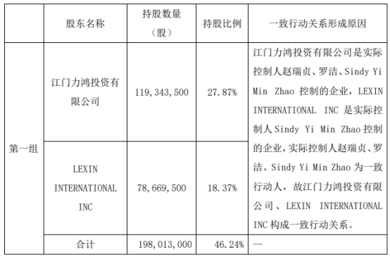 力鸿公司是迪生力实际控制人赵瑞贞、罗洁、Sindy Yi Min Zhao控制的企业,LEXIN INTERNATIONAL INC是实际控制人Sindy Yi Min Zhao控制的企业,实际控制人赵瑞贞、罗洁、Sindy Yi Min Zhao为一致行动人,故力鸿公司、LEXIN INTERNATIONAL INC构成一致行动关系。力鸿公司、LEX ININTERNATIONAL INC合计持有迪生力198,013,000股,持股比例为46.24%。