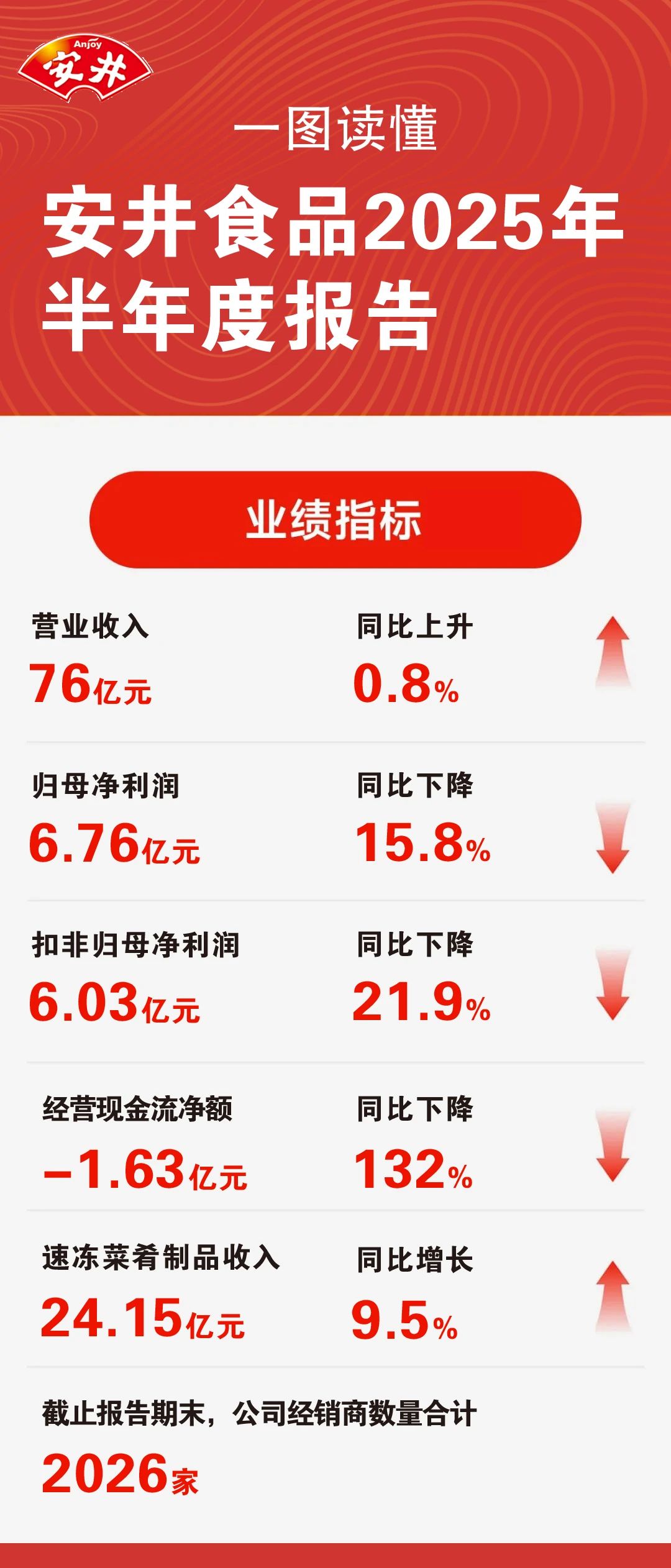 昨日晚间,安井食品公布2025年半年报,公司营业收入为76亿元,同比上升0.8%;归母净利润为6.76亿元,同比下降15.8%;扣非归母净利润为6.03亿元,同比下降21.9%;经营现金流净额为-1.63亿元,同比下降132%;