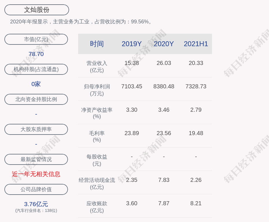 2020年年报显示,文灿股份的主营业务为工业,占营收比例为:99.56%。