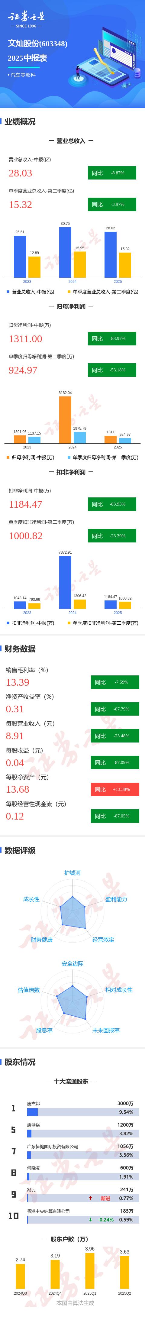 证券之星消息,文灿股份2025年中报显示,公司主营收入28.03亿元,同比下降8.88%;归母净利润1311.0万元,同比下降83.98%;扣非净利润1184.47万元,同比下降83.93%;其中2025年第二季度,公司单季度主营收入15.32亿元,同比下降3.97%;单季度归母净利润924.97万元,同比下降53.18%;单季度扣非净利润1000.82万元,同比下降23.39%;负债率51.88%,财务费用2580.56万元,毛利率13.39%。