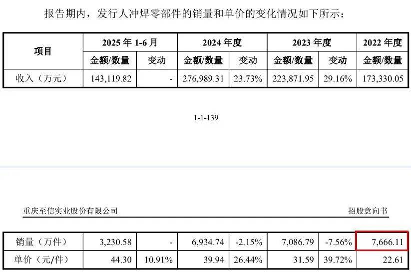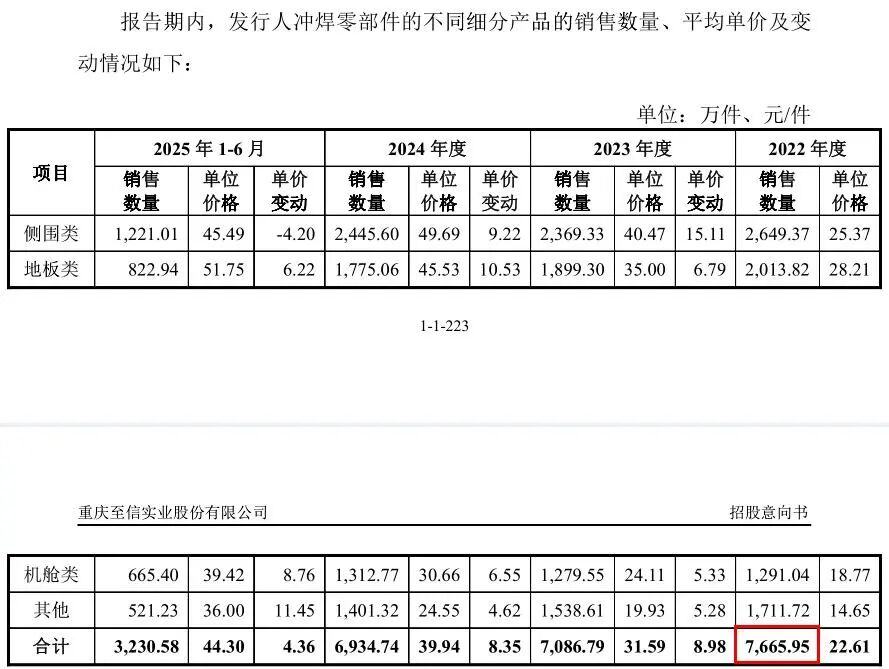 根据招股书第139页,至信股份列表分析报告期内冲焊零部件产品的销量和单价变化,2022年至2025年1-6月的产品销量分别为7,666.11万件、7,086.79万件、6,934.74万件、3,230.58万件,单价分别为22.61元/件、31.59元/件、39.94元/件、44.30元/件。而招股书第223页显示,至信股份又按照侧围类、地板类、机舱类、其他类四类冲焊零部件产品来分析各年度的销量及单价变动情况,2022年至2025年1-6月,四类冲焊零部件产品的各期合计销量分别为7,665.95万件、7,086.79万件、6,934.74万件、3,230.58万件。招股书两处地方披露的2022年的冲焊零部件销量相差了0.16万件,但各期的销售单价则完全一致。