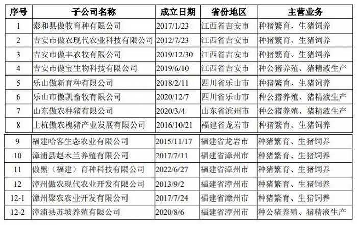 目标公司傲芯生物旗下子公司的情况。图片来源:傲农生物公告
