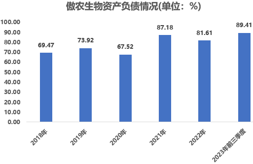 因行业低迷,公司亏损,加之傲农生物近年来的激进扩张,最近几年,傲农生物的流动性较为紧张。截至2023年前三季度,傲农生物的资产负债率高达89.41%,同期公司的流动比率为0.36倍,速动比率为0.14倍,双双低于1倍。