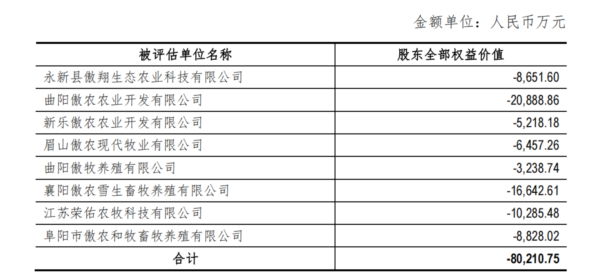 据傲农生物聘请的评估机构评估,上述8家公司经过评估后的股东全部权益价值合计约-8.02亿元。
