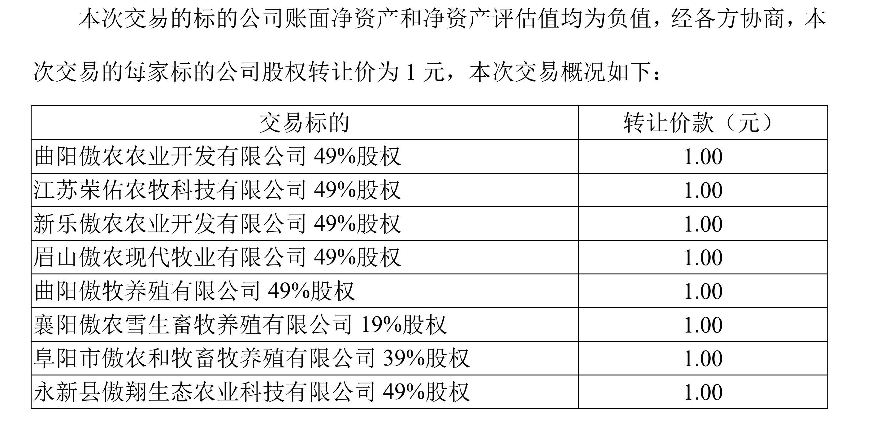 而对于每家公司部分股权转让价格为何为1元,傲农生物表示,本次交易的标的公司账面净资产和净资产评估值均为负值,经各方协商,本次交易的每家标的公司股权转让价为1元。