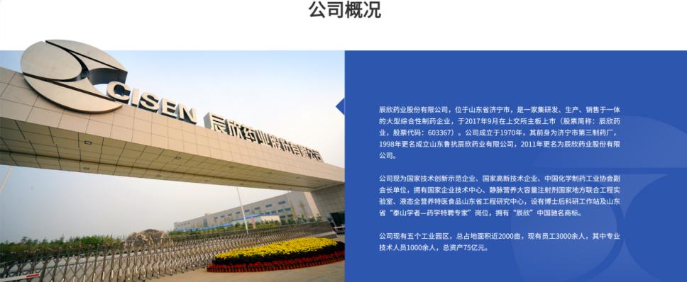 官网显示,辰欣药业股份有限公司位于山东省济宁市,是一家集研发、生产、销售于一体的大型综合性制药企业,于2017年9月在上交所主板上市(股票简称:辰欣药业,股票代码:603367)。公司成立于1970年,其前身为济宁市第三制药厂,1998年更名成立山东鲁抗辰欣药业有限公司,2011年更名为辰欣药业股份有限公司。该公司现有五个工业园区,总占地面积近2000亩,现有员工3000余人,其中专业技术人员1000余人,总资产75亿元。公司产品涉及大容量注射剂、小容量注射剂、冻干粉针剂、片剂、胶囊、膏剂、滴剂、原料药等多种剂型400多个规格,涵盖基础输液、营养型输液、治疗型输液、肿瘤、抗菌抗病毒、呼吸系统、消化系统、神经系统、肝病、慢病等用药领域,销售网络遍布全国以及世界50多个国家和地区。