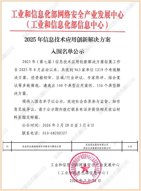 日前,国家工业和信息化部网络安全产业发展中心(工业和信息化部信息中心)正式公布了2025年信息技术应用创新解决方案入围名单。辰欣药业股份有限公司牵头申报的“高端制剂车间数智化解决方案”,经资格初审、区域/行业评议、专家终审、综合复议等多轮筛选,从众多参评项目中脱颖而出,成功入围!这是对我司坚持自主创新、推动信息技术与制药产业深度融合的高度肯定,也是我司在数字化转型道路上取得的又一重要里程碑。