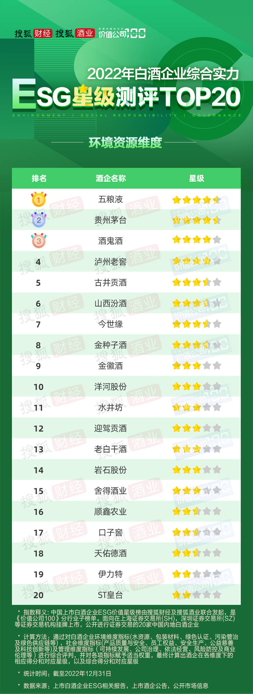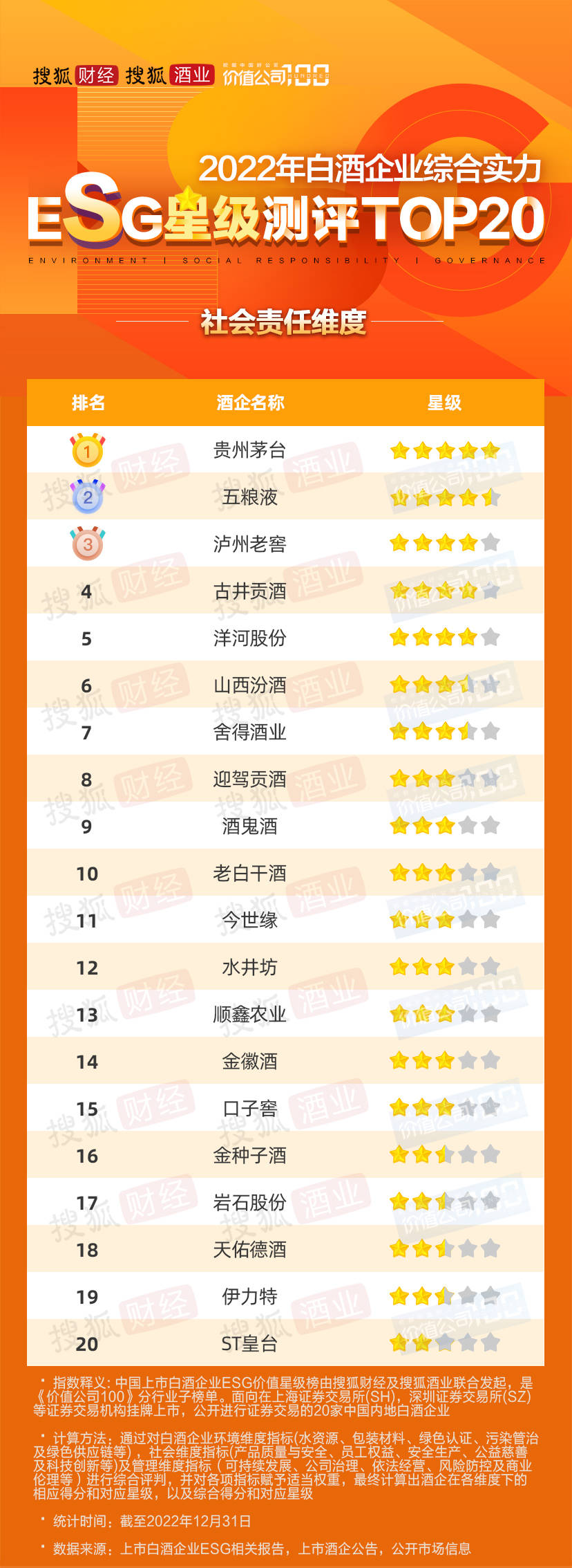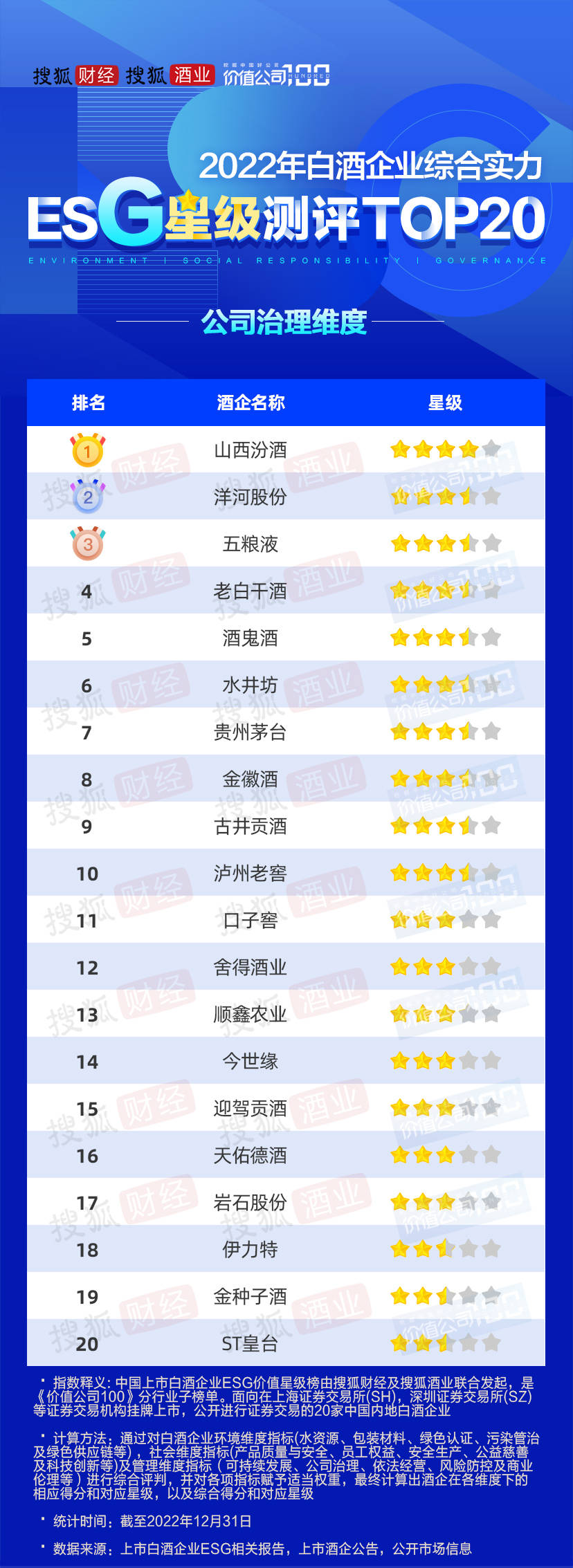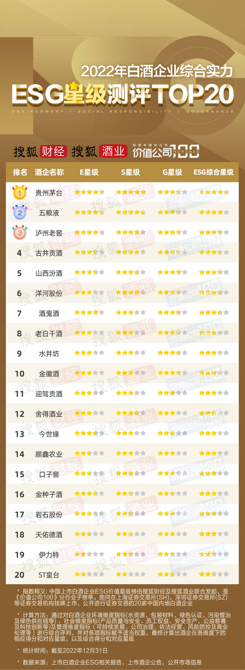 “中国上市白酒企业ESG星级榜”为价值公司100系列价值榜单下的分行业子榜单,由搜狐财经及搜狐酒业联合发起,通过对白酒企业环境维度指标(水资源、包装材料、绿色认证、污染管治及绿色供应链等) ,社会维度指标(产品质量与安全、员工权益、安全生产、公益慈善及科技创新等)及管理维度指标(可持续发展、公司治理、依法经营、风险防控及商业伦理等)进行综合评判,并对各项指标赋予适当权重,最终计算出酒企在各维度下的相应得分和对应星级,以及综合得分和对应星级。