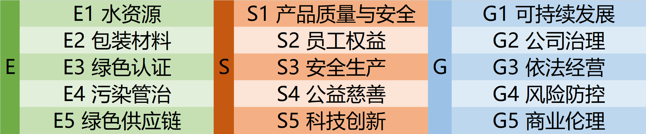 中国特色化指在指标选取的过程中,基于我国现行的本土化的ESG标准和企业对应的ESG信息披露框架,完善指标维度。例如,在环境维度下,完善对白酒企业绿色产品认证/绿色工厂认证等方面的考量;在社会维度下,完善对安全演习次数/安全事故整改率/乡村振兴投入等方面的考量;在治理维度下,完善对股东人数变化/董事会学历构成/近一年董事离职率等方面的考量。