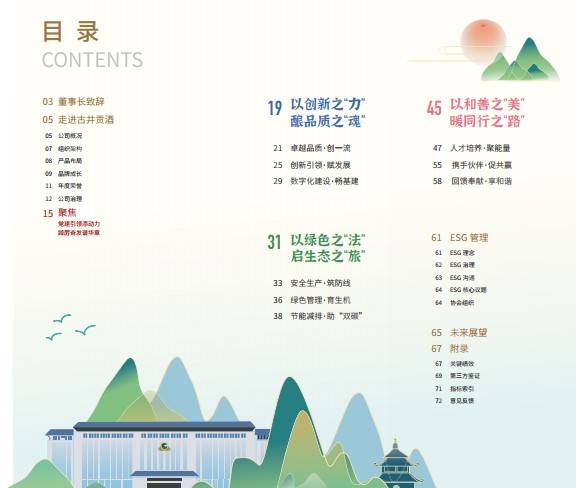 古井贡酒ESG报告目录(来源:企业ESG报告)而最为重要的披露数据及内容,也由对企业ESG成果的简单文字性描述,变为了一份完整且专业的,参考深交所专项要求及各部门标准,有各维度明确的内容展示,配以具体数据支撑和图片示意,并提供第三方鉴证声明书的ESG报告。