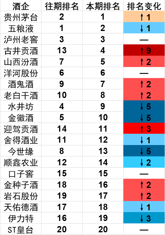 此外,相较于上期榜单,部分企业排名也有了较大的变动。其中,安徽古井贡酒股份有限公司排名上升明显,共上升9位,位列总榜第四,该公司也是排名上升最多的企业。而四川水井坊股份有限公司、金徽酒股份有限公司及江苏今世缘酒业股份有限公司则成为排名下降最多的企业,均下降5位,分别排在总榜第9、第10和第13位。
