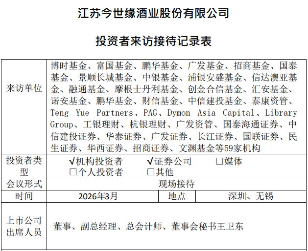 近日,今世缘发布了3月份的投资者来访接待记录表,今世缘董事、副总经理、总会计师、董事会秘书王卫东接待并回复了包括博时基金、富国基金、鹏华基金、广发基金等59 家机构提出的28个问题。这些问题涉及市场拓展、核心产品销售情况等。