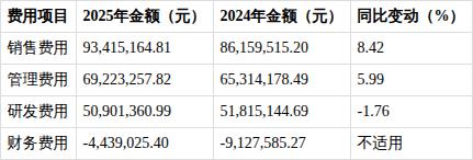 2025年公司期间费用合计209,100,758.22元,较2024年的194,161,253.11元增长7.70%,费用增速高于营收增速,对盈利形成一定压力。