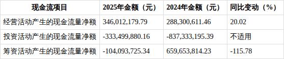 投资活动现金流净额-333,499,880.16元,较2024年的-837,333,195.39元流出减少,主要因本期理财赎回增加,收回投资收到的现金从580,217,458.33元增至1,489,863,866.30元,增长156.76%,而投资支付的现金从1,182,500,000.00元增至1,647,378,266.30元,增长39.31%,流入增速远超流出。