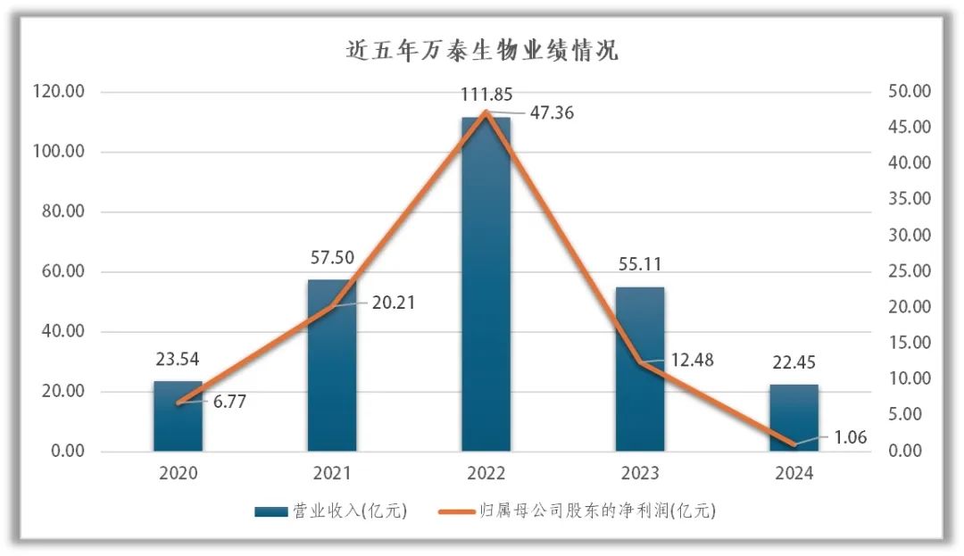 根据年报披露,2024年万泰生物实现营业收入22.45亿元,较上年同期降低59.25%;实现归母净利润1.06亿元,较上年同期降低91.49%。无论是收入还是利润,万泰生物在2024年都出现了大幅度的缩水。
