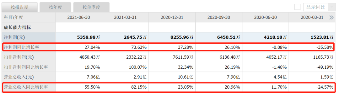 然而,就在公司股价大涨11倍的这期间,公司单季度营收只不过从1.59亿增长到4.15亿,增幅1.6倍,业绩只是从1523.81万增长到2713.23万,增幅仅78%。从报告期看同比,今年一季度营收同比增长82.15%、净利润同比增长73.63%,上半年营收同比增长55.5%、净利润同比增长27.04%。