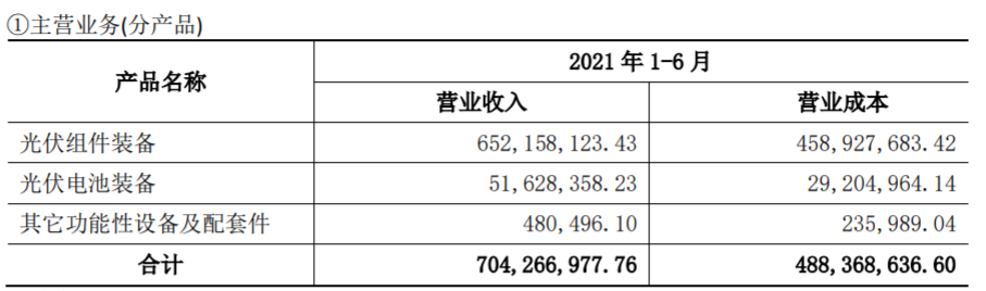 今年上半年,公司整体营收7.06亿,其中光伏组件装备产品营收6.52亿、光伏电池装备产品营收5162.84万、其它功能性设备及配套件收入48.05万。