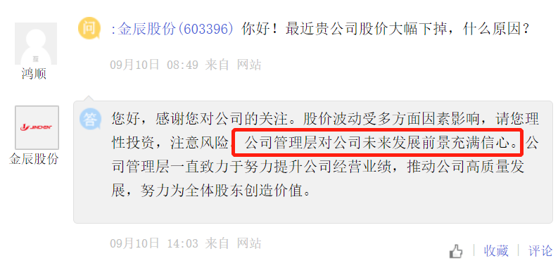 巧合的是,公司股价近期连连下跌,正是第二大股东北京金辰实施减持的期间。然而,当投资者在互动平台问董秘公司股价近期为什么跌时,董秘却理直气壮的回答“公司管理层对公司未来发展前景充满信心。”
