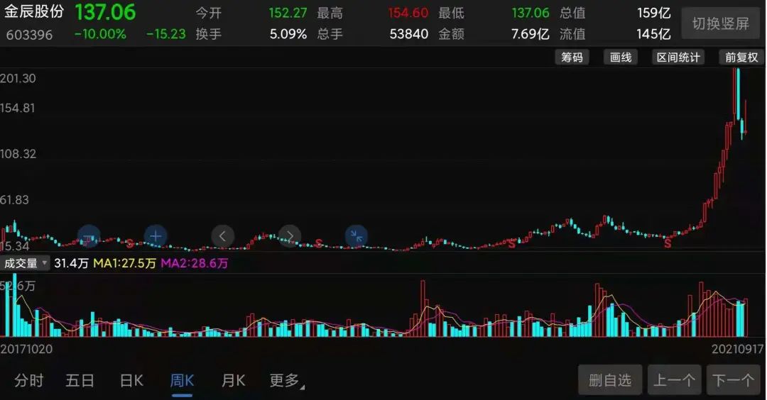 金辰股份这两年的股价涨幅主要发生在今年4月下旬到8月底这段时间,在短短4个多月时间里,公司股价从27.86元一路涨到201.30元的高位,最大涨幅622.54%,市值在这期间飙升了200多亿!