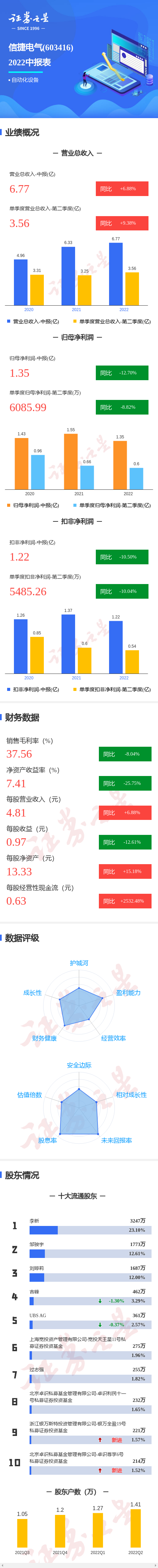 信捷电气2022中报显示,公司主营收入6.77亿元,同比上升6.88%;归母净利润1.36亿元,同比下降12.7%;扣非净利润1.23亿元,同比下降10.5%;其中2022年第二季度,公司单季度主营收入3.56亿元,同比上升9.38%;单季度归母净利润6085.99万元,同比下降8.82%;单季度扣非净利润5485.26万元,同比下降10.04%;负债率28.13%,投资收益1374.78万元,财务费用-279.88万元,毛利率37.56%。