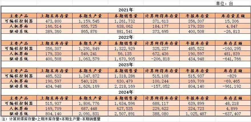 根据信捷电气2020年至2024年年报关于公司产销量及库存量分析数据,2021年至2024年信捷电气的可编程控制器、人机界面、驱动系统的库存量与实际计算的库存量(库存量=上期库存量+本期生产量-本期销售量)存在出入。年报中并未说明前述产销量中是否包含委外补充生产的产品。若该差额由于损耗、退货、盘亏、盘盈等因素导致,但2022年人机界面存在计算库存量与年报披露的库存量差额远超年报库存量的情况,其他年份也存在类似情况,对于这种情况,信捷电气或应给出合理解释。