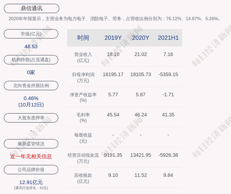 2020年年报显示,鼎信通讯的主营业务为电力电子、消防电子、劳务,占营收比例分别为:76.12%、14.87%、5.26%。