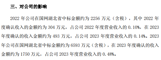 2022年,鼎信通讯在国网湖北省中标金额约2256万元(含税),其中2022年度确认收入金额约304万元,占鼎信通讯2022年度营业收入的0.10%;在2023年度确认收入金额约493万元,占鼎信通讯2023年度营业收入的0.14%。