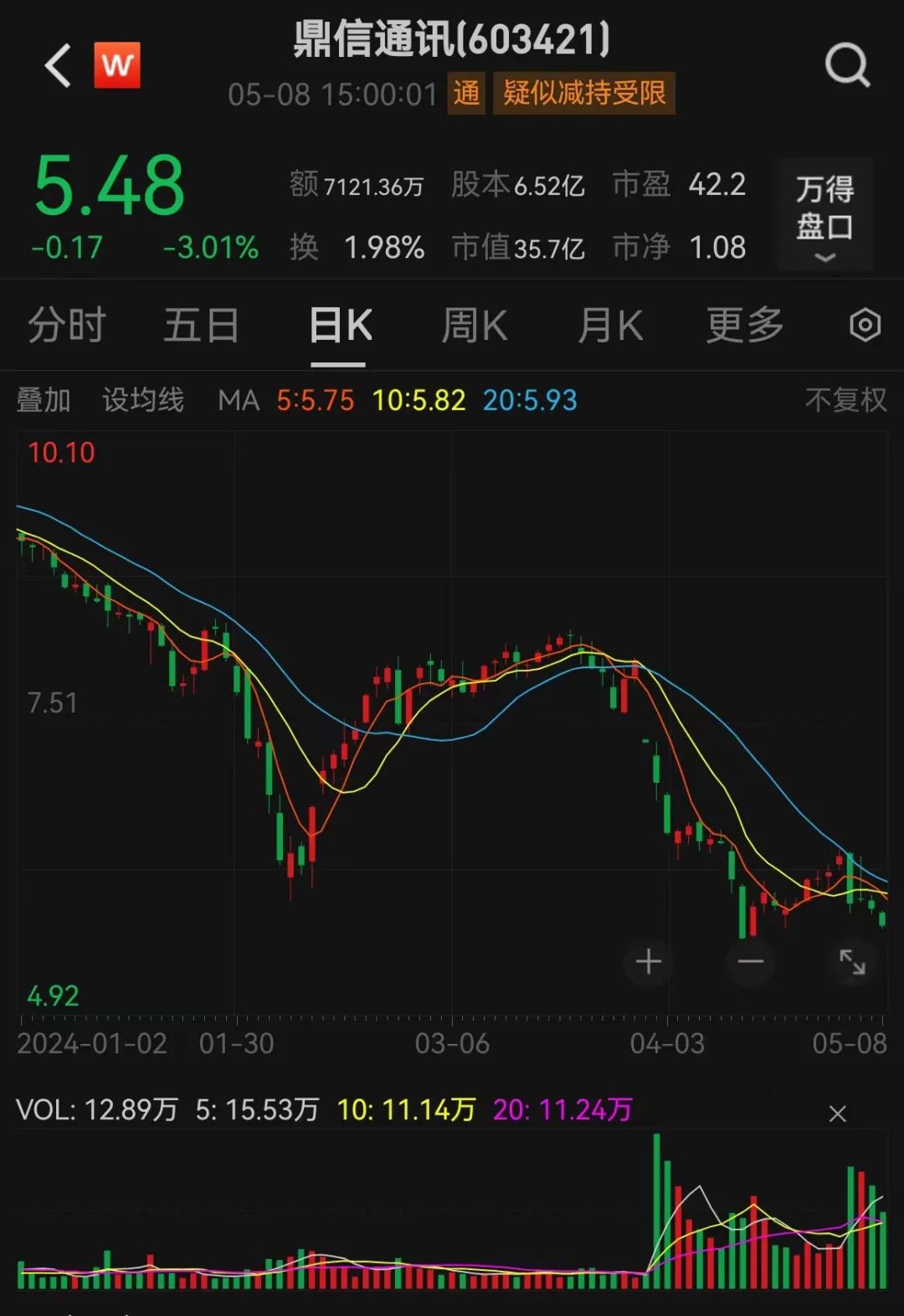 截至5月8日,鼎信通讯股价报5.48元,市值为35.7亿元。