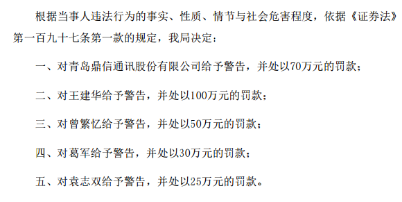 对此,青岛证监局根据当事人违法行为的事实、性质、情节与社会危害程度,依据《证券法》第一百九十七条第一款规定,决定对鼎信通讯及王建华等人给予警告,并处以相应罚款。