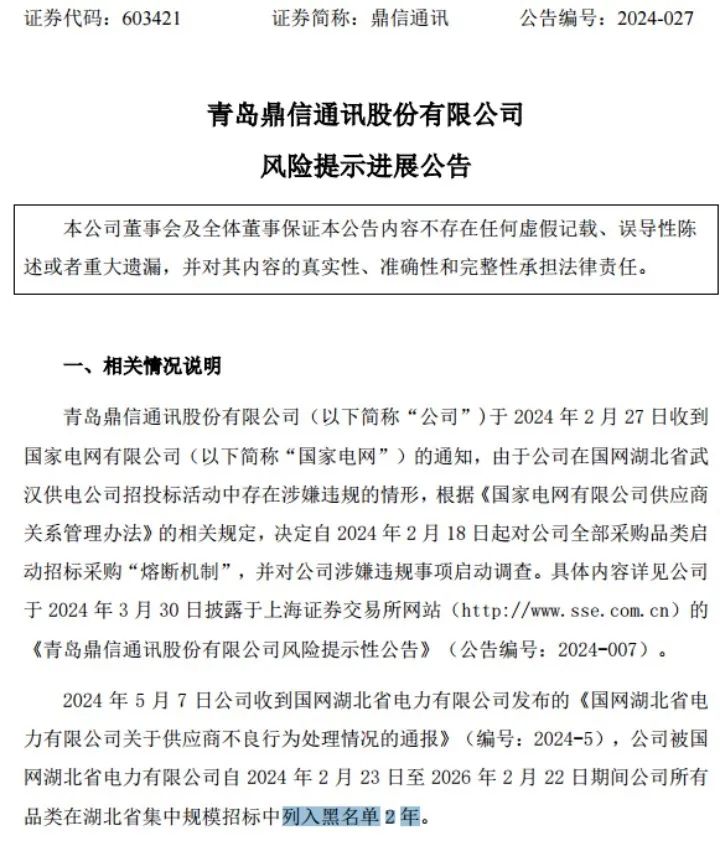 5月8日晚间,鼎信通讯公告称,国网湖北省电力有限公司(简称“国网湖北公司”)自2024年2月23日至2026年2月22日,将公司所有品类在湖北省集中规模招标中列入黑名单2年。