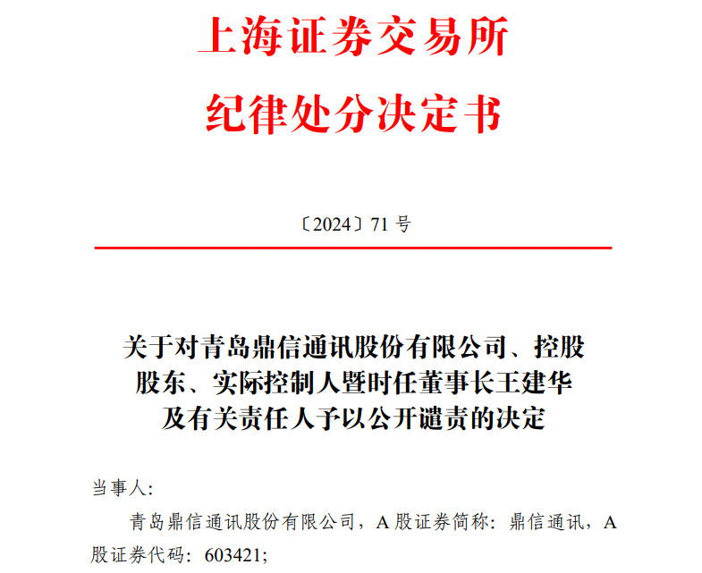 4月25日,上海证券交易所发布关于对青岛鼎信通讯股份有限公司、控股股东、实际控制人暨时任董事长王建华及有关责任人予以公开谴责的决定。