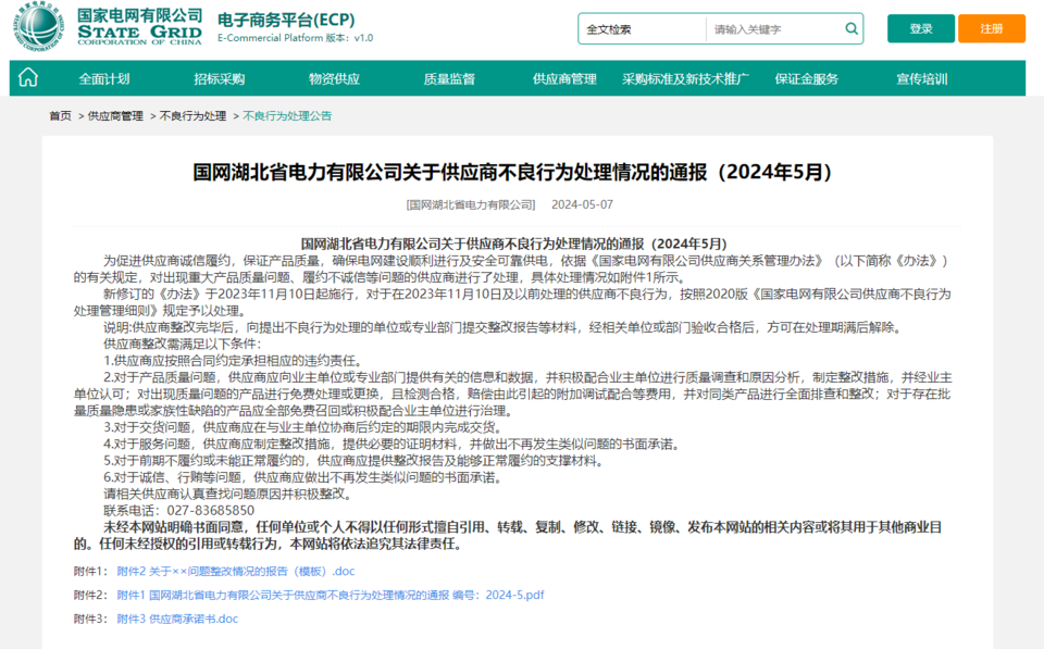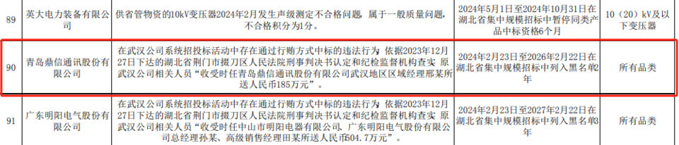 5月7日,国网湖北省电力有限公司关于供应商不良行为处理情况的通报(2024年5月)。青岛鼎信通讯股份有限公司(以下简称鼎信通讯)在武汉公司系统招投标活动中存在通过行贿方式中标的违法行为,依据2023年12月27日下达的湖北省荆门市掇刀区人民法院刑事判决书认定和纪检监督机构查实,原武汉公司相关人员“收受时任青岛鼎信通讯股份有限公司武汉地区区域经理邢某所送人民币185万元”。鼎信通讯被国网湖北省电力有限公司列入集中规模招标黑名单2年。