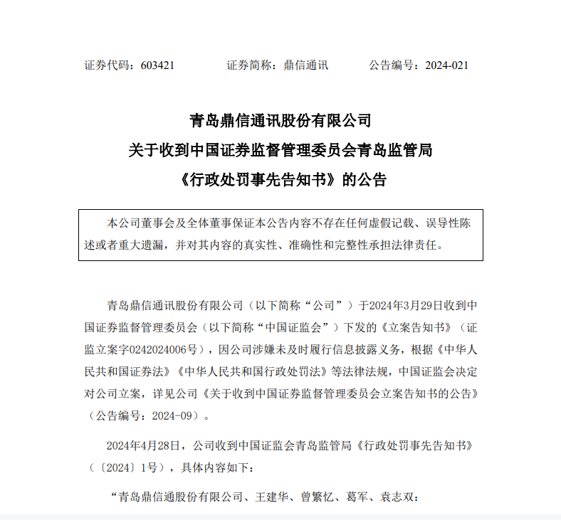 4月30日,鼎信通讯发布公告称,公司收到中国证监会青岛监管局《行政处罚事先告知书》(〔2024〕1号)。公司涉嫌未及时履行信息披露义务一案,已由青岛监管局调查完毕,依法拟对你们作出行政处罚。经查明,公司涉嫌违法的事实如下:一、鼎信通讯未及时披露生产经营的外部条件发生重大变化;二、鼎信通讯未及时披露控股股东、实际控制人所持股份处分情况。我局认为,鼎信通讯上述未按照规定履行信息披露义务的行为,构成《中华人民共和国证券法》第一百九十七条第一款所述违法行为,青岛监管局拟决定:对鼎信通讯及相关责任人员作出行政处罚。