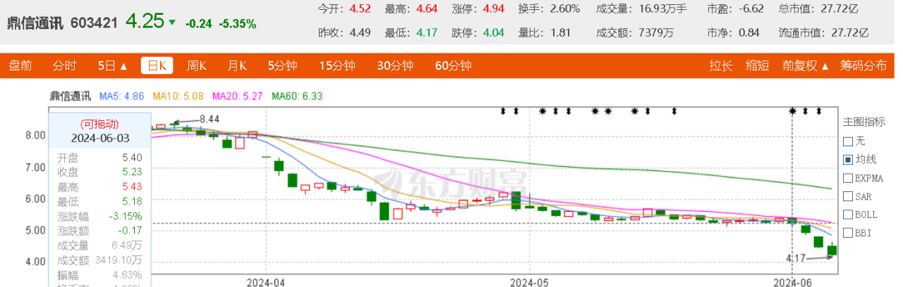 截至2024年6月6日,鼎信通讯股价报收4.25元,下跌5.35%,本周开市以来,公司股价已连续4个交易日下跌。《电鳗财经》将对鼎信通讯后续股价走势,及相关事件对公司业绩的影响保持关注。