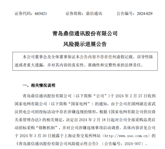 《电鳗财经》关注到,鼎信通讯发布的风险提示进展公告显示,2024 年 2 月 27 日,公司收到国家电网的通知,由于公司在国网湖北省武汉供电公司招投标活动中存在涉嫌违规的情形,根据《国家电网有限公司供应商关系管理办法》的相关规定,决定自 2024 年 2 月 18 日起对公司全部采购品类启动招标采购“熔断机制”,并对鼎信通讯涉嫌违规事项启动调查。