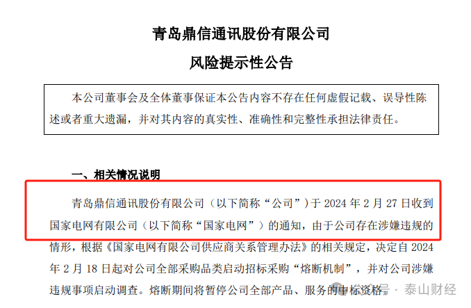 2024年2月份,国家电网发布公告,由于鼎信通讯存在涉嫌违规的情形,决定自2月18日起对鼎信通讯全部采购品类启动招标采购“熔断机制”,并对公司涉嫌违规事项启动调查。熔断期间,将暂停公司全部产品、服务的中标资格。