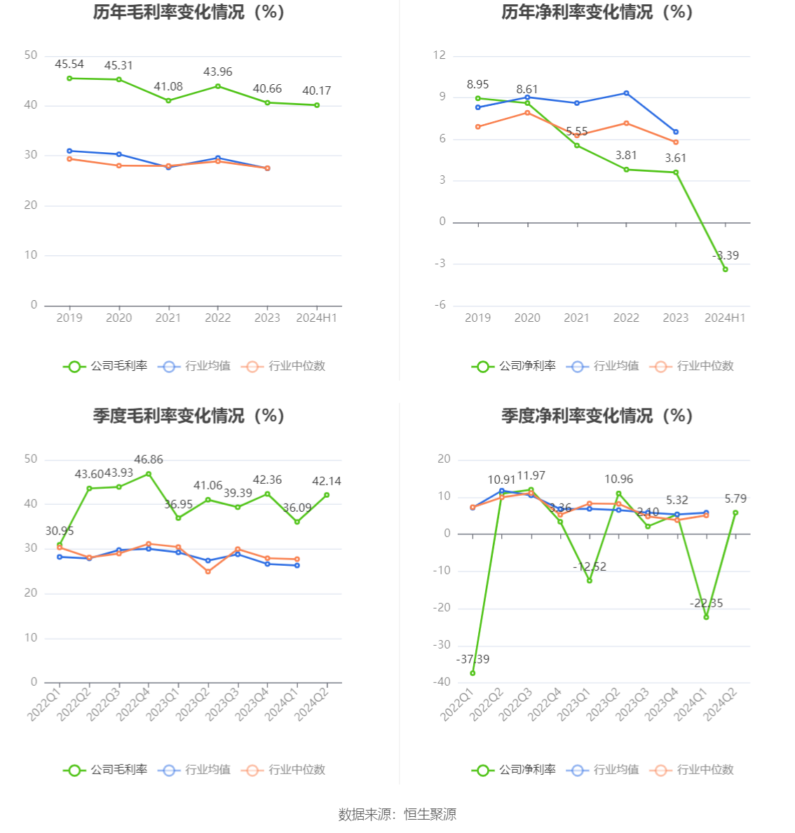 2024年上半年,公司毛利率为40.17%,同比上升0.55个百分点;净利率为-3.39%,较上年同期下降6.10个百分点。从单季度指标来看,2024年第二季度公司毛利率为42.14%,同比上升1.08个百分点,环比上升6.05个百分点;净利率为5.79%,较上年同期下降5.17个百分点,较上一季度上升28.14个百分点。