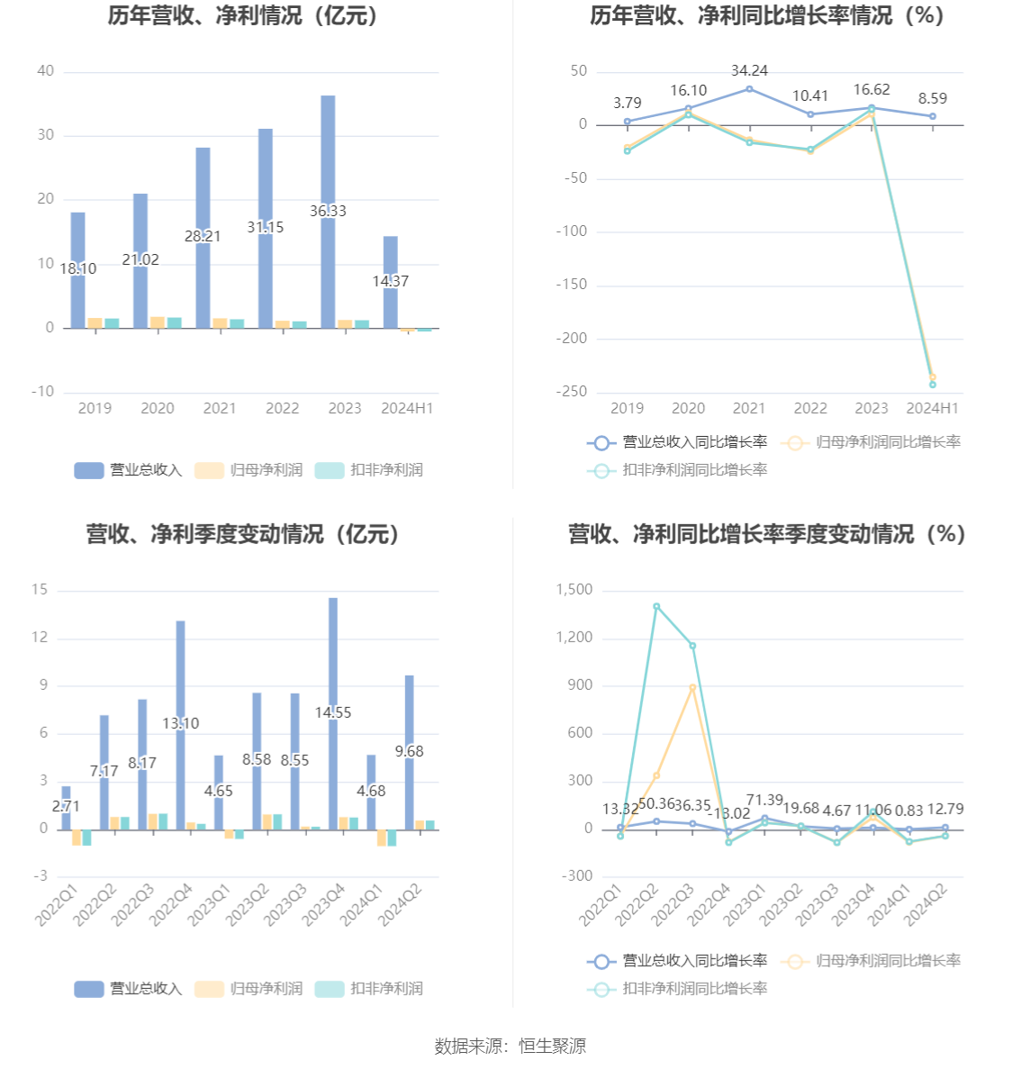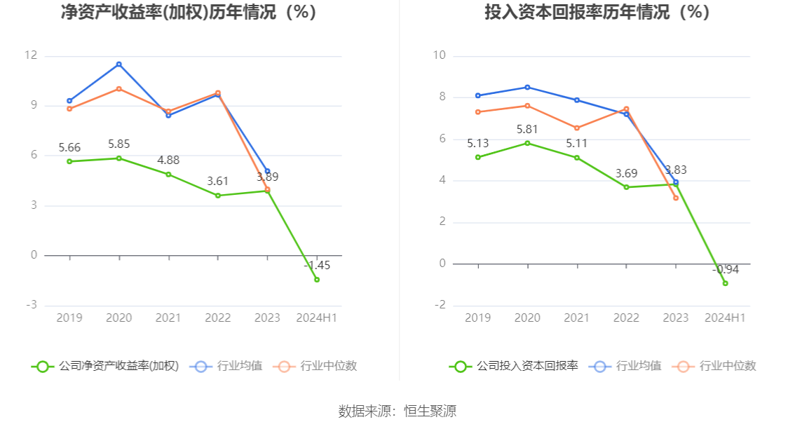 数据显示,2024年上半年公司加权平均净资产收益率为-1.45%,较上年同期下降2.52个百分点;公司2024年上半年投入资本回报率为-0.94%,较上年同期下降2.04个百分点。