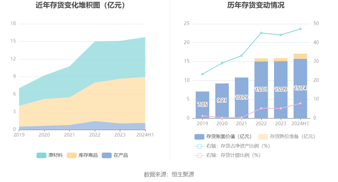 从存货变动来看,截至2024年上半年末,公司存货账面价值为15.74亿元,占净资产的47.26%,较上年末增加6536.44万元。其中,存货跌价准备为1.35亿元,计提比例为7.89%。