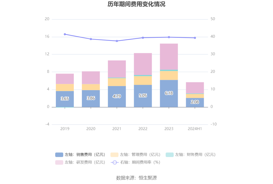 2024年上半年,公司期间费用为5.66亿元,较上年同期增加3489.59万元;但期间费用率为39.40%,较上年同期下降0.75个百分点。其中,销售费用同比下降5.84%,管理费用同比增长17.16%,研发费用同比增长16.8%,财务费用同比下降15.58%。