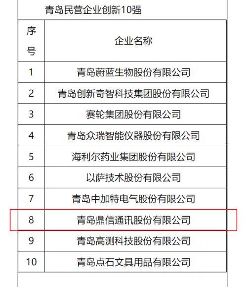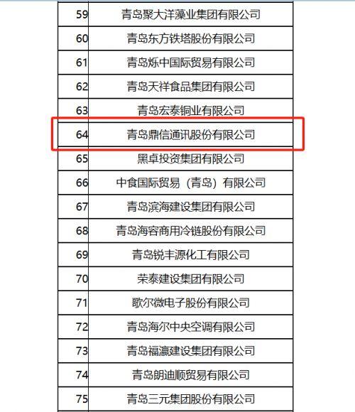 在这个充满机遇与挑战的时代,青岛,这座海滨之城,正以它独有的魅力与活力,孕育着无数民营企业的辉煌与梦想。今天,我们要和大家分享一个振奋人心的消息——青岛鼎信通讯股份有限公司(以下简称“鼎信通讯”),在2024年青岛民营企业100强系列榜单中大放异彩,不仅荣获“青岛民营企业100强”第64名,更在“青岛民营企业创新十强”中占据第8席,双料佳绩,实至名归!