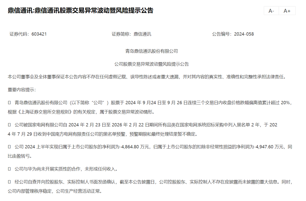 9月27日,鼎信通讯发布公告披露,近日该公司收到控股股东、实际控制人王建华先生通知,得知其收到了北京市西城区人民法院文书送达告知书((2024)京0102民初8686号),因王建华先生(以下称被告)涉及离婚后财产纠纷,前妻张启女士(以下称原告)请求法院依法判决:“1、解除原被告之间签订的离婚协议第三条第一款关于被告代持原告所享有的青岛鼎信通讯股份有限公司股份46132372股代持协议约定条款,并确认上述股份由原告所有;2、判令被告和第三人(指公司)为原告办理青岛鼎信通讯股份有限公司股份46132372股的股权变更登记手续;3、该案诉讼费、保全费由被告承担。”