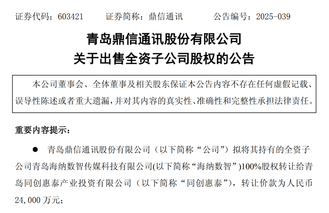 7月22日晚间,青岛鼎信通讯股份有限公司(以下简称“鼎信通讯”)发布公告,拟将其所持全资子公司青岛海纳数智传媒科技有限公司(以下简称“海纳数智”)100%股权,以2.4亿元的交易价格转让给青岛同创惠泰产业投资有限公司(以下简称“同创惠泰”)。